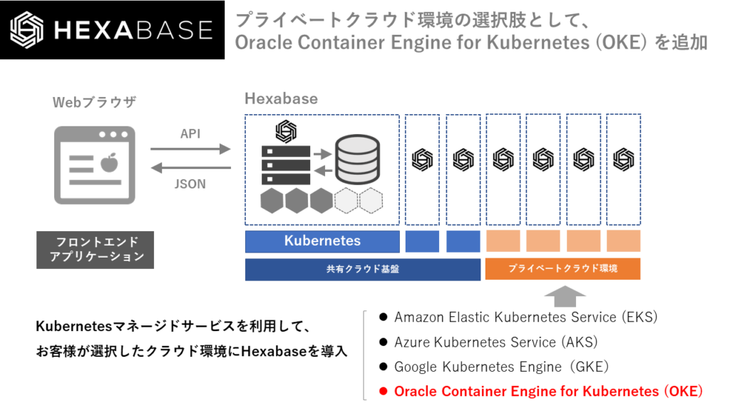Hexabaseは、プライベートクラウド環境の選択肢としてオラクルが提供するOracle® Container Engine for Kubernetes (以下OKE)に対応しました。これにより、Hexabaseを利用してシステム構築・運用するお客様にとってクラウドサービス基盤の選択肢が広がり、より最適なシステム構築を可能にします。