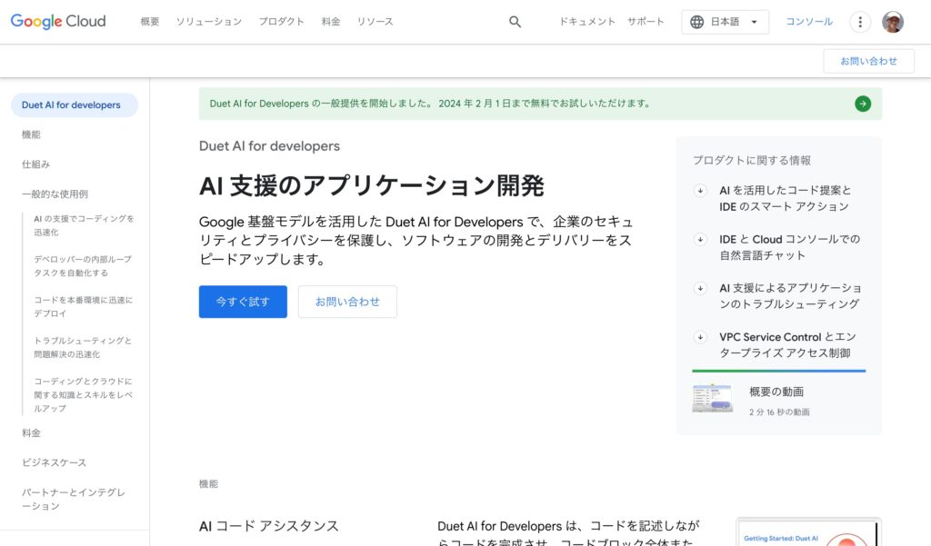 Google Cloud Duet AI for developersはGoogleが開発する生成AIであるDuet AIを、開発者向けに提供するサービスです。Duet AIは、コードの自動補完、コードの自動生成、コードの自動修正などを行います。チャットインタフェースも用意されています。