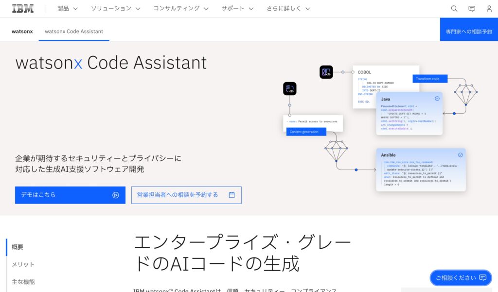 IBM watsonx Code AssistantはIBMが提供する生成AIサービスです。自然言語からのコード生成、コードのマッチング、レガシーコードのリファクタリング、言語変換などが可能です。