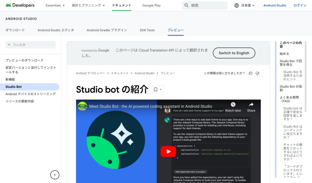 Studio botはAndroid Studioに搭載されている生成AIです。開発コンパニオンであり、チャット機能を提供します。ファイルに直接コードを生成してくれる訳ではありません。