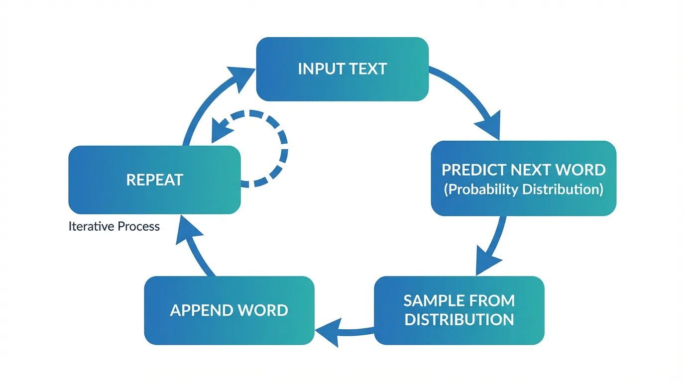 それは「次に来る単語の確率分布を予測し、そこからランダムにサンプリングする」という処理の繰り返しです。