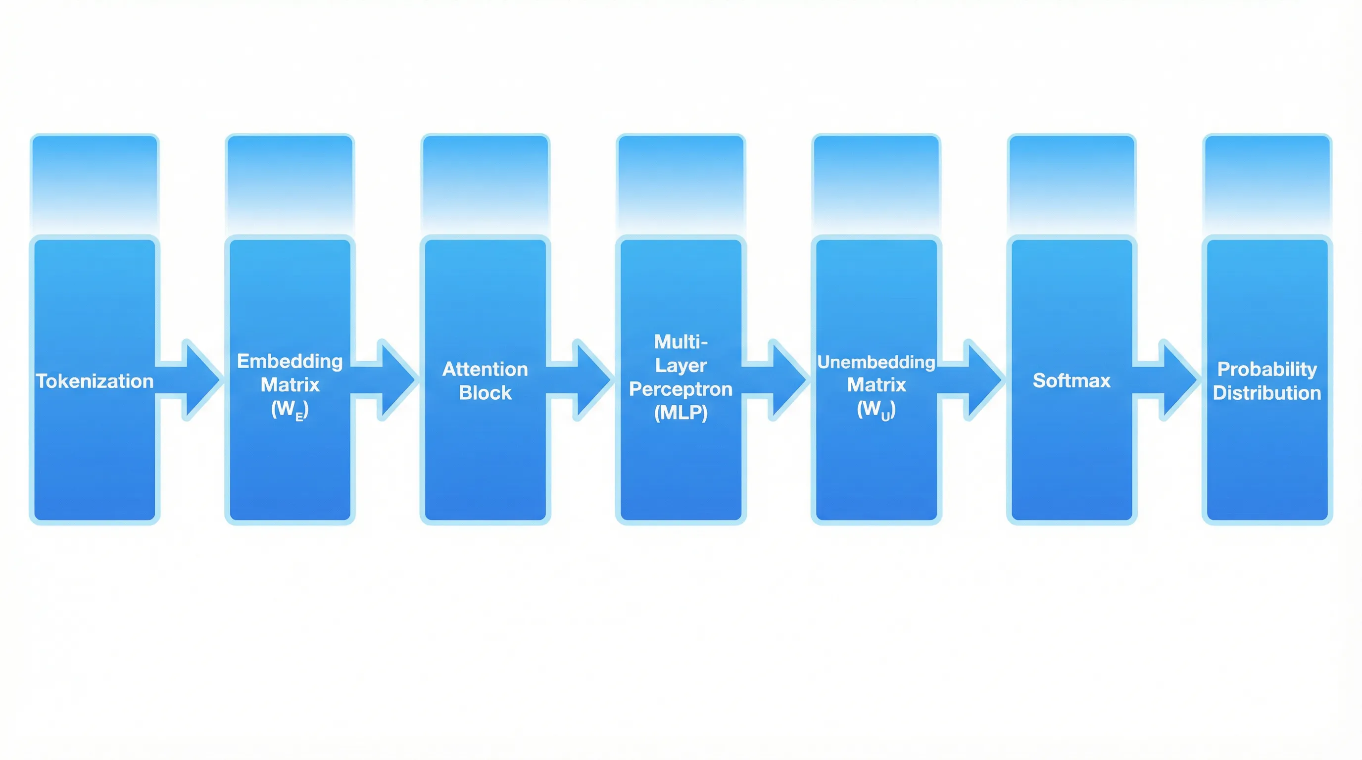 - ⑤ 確率分布の出力:最後のベクトルを掘り出し行列(W_U)で変換し、ソフトマックス関数で正規化して、次に来るトークンの確率分布を生成します