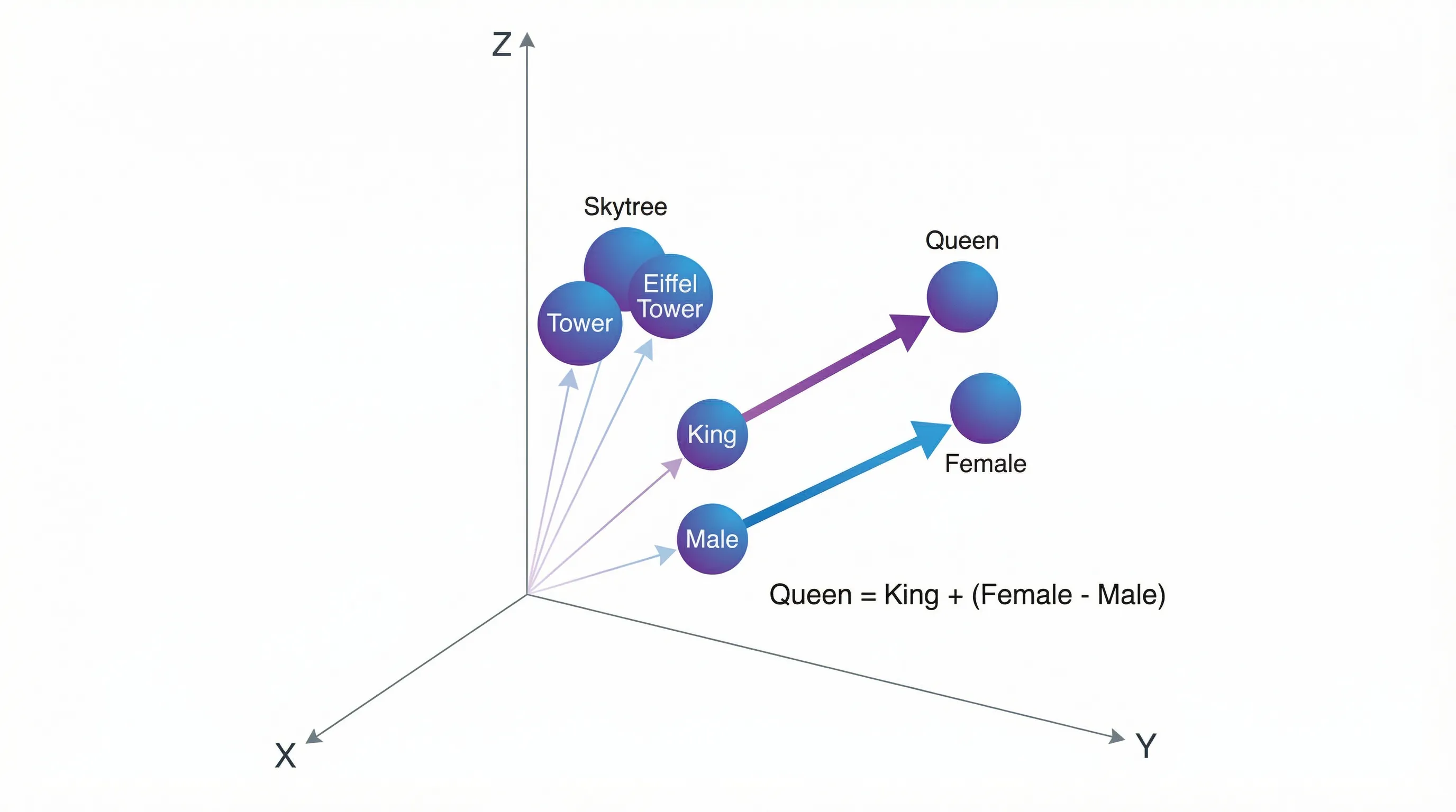 - 女王 = 王 + (女性 - 男性):「女性」と「男性」のベクトルの差を取ると「性別の方向」が得られ、これを「王」に足すと「女王」に近いベクトルになります