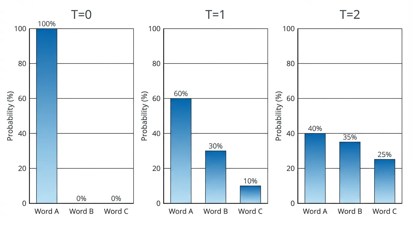 ChatGPTなどのツールでは、温度パラメータ(T)で分布の「鋭さ」を調整できます。
