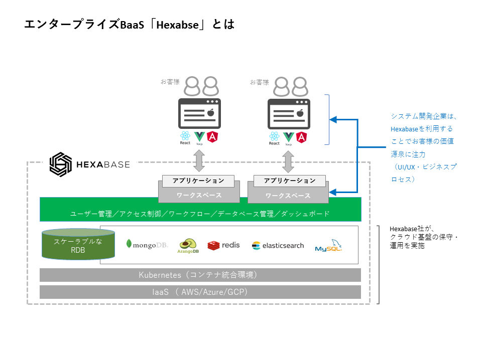 (Backend as a Service)です。 Hexabaseを利用することで、システム開発企業は、高効率・短納期でシステムを開発でき、お客様のビジネス価値の源泉に注力(UI/UX・ビジネスプロセス)できます。