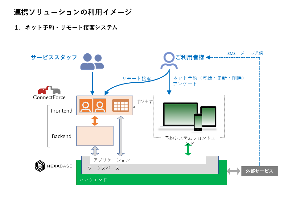 このシステムは、医療機関のリモート診断や保険・証券サービスのリモートコンサルティングを想定したものです。このシステムでは、予約システム側をHexabaseで実現し、リモート接客側をConnectForceが実現し、それをシームレスに連携させています。コロナ禍の影響により、リモートで対応する範囲が広がるなか、直接対面しなくても、満足度が高く効率的なリモート接客を可能にします。