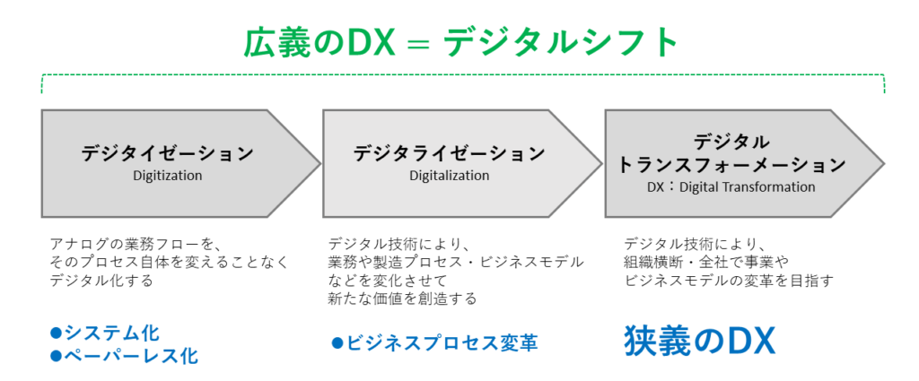 現在DXと呼ばれているものは、「広義のDX」と「狭義のDX」とがあります。「デジタルシフト」は、この「広義のDX」とほぼ同じ意味と考えるとわかりやすいと思います。広義のDXは、デジタイゼーション・デジタライゼーション・狭義のDXを組み合わせた全体を指しているからです。
