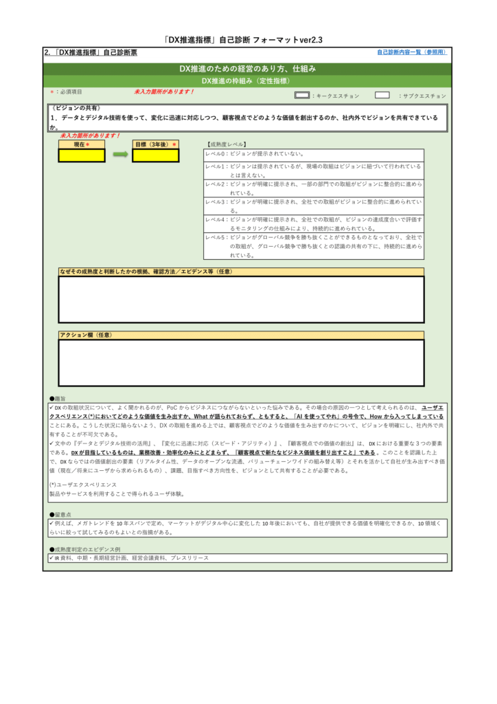 自己診断には「自己診断フォーマットver2.3」というExcelファイルを利用します。このシートに必要事項を入力して自動診断できるのです。たとえば「ビジョンの共有」という項目は次のようになっています。こういった約20ページのアンケートに回答すると、診断結果が表示されます。