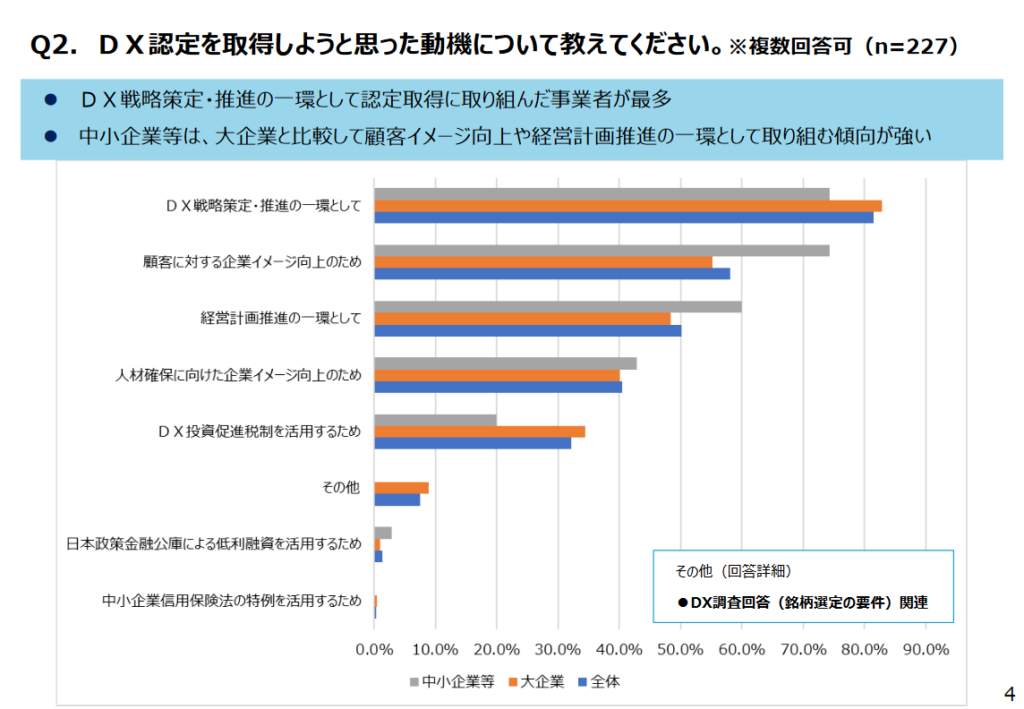経済産業省の「DX認定事業者アンケート結果」によると、「DX戦略策定・推進の一環」や「顧客に対する企業イメージ向上」のために取り組む傾向が強いとしています。