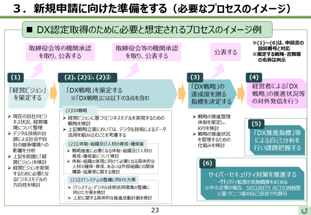 では、DXの現状を把握する「DX推進指標」とは、どんな内容なのでしょうか。経済産業省が公開している「DX推進指標とそのガイダンス」という資料では、DX認定を新規申請に向けた準備を次のように説明しています。
