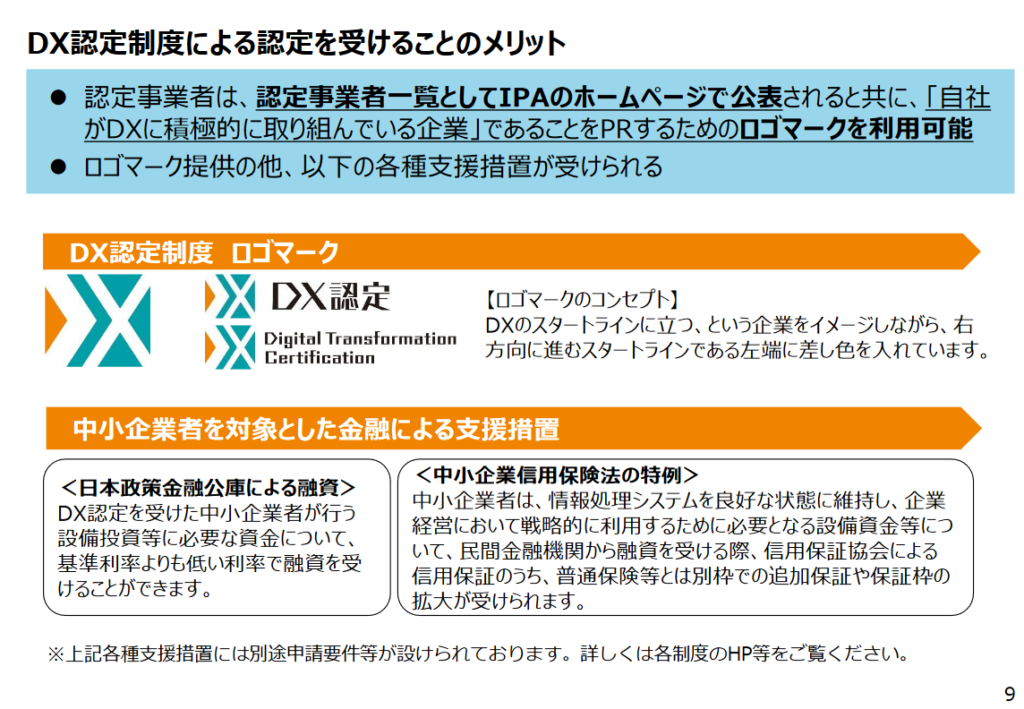 さらにDX認定を受けることで、「日本政策金融公庫による融資」や「中小企業信用保険法の特例」といったメリットが受けられます。