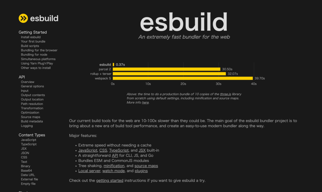 もしwebpackの速度面でストレスを感じているならば使ってみたいのがesbuildです。Go製のソフトウェアで、とにかく高速です。TypeScriptにもデフォルトで対応していますが、型チェックは行ってくれないので注意が必要です。