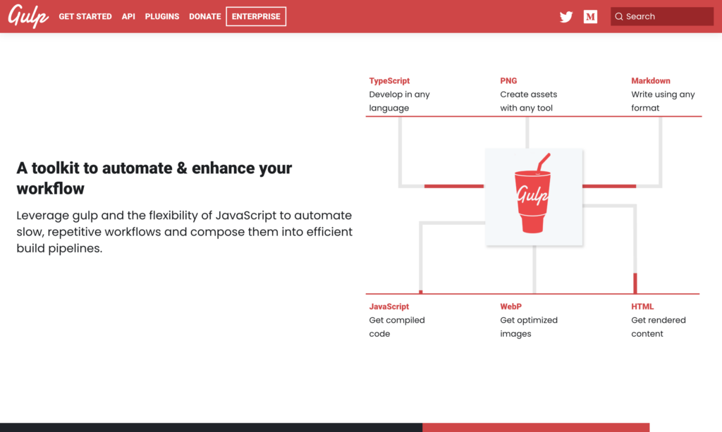 タスクランナーの先駆者にあたるソフトウェアです(最初のリリースが2013年9月)。taskというメソッドの中で、実際に行いたいタスクを記述します。SassやLess、CoffeeScriptなどJavaScriptやCSSの代替言語の変換でよく用いられていました。