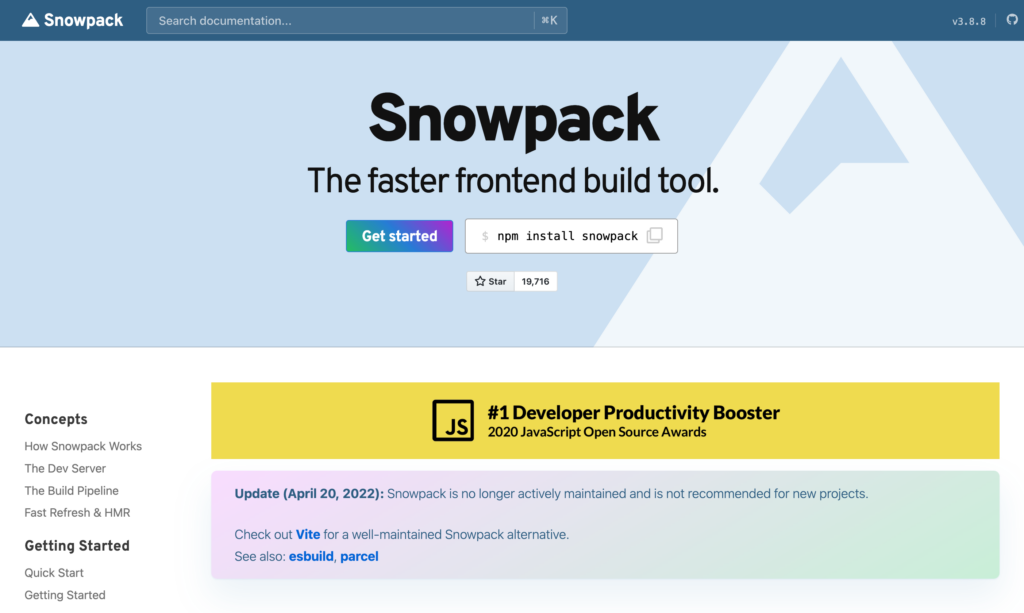 SnowpackもViteに近いコンセプトのソフトウェアでした。2022年4月でアクティブなメンテナンスを停止しており、Viteを利用するようにお勧めされています。