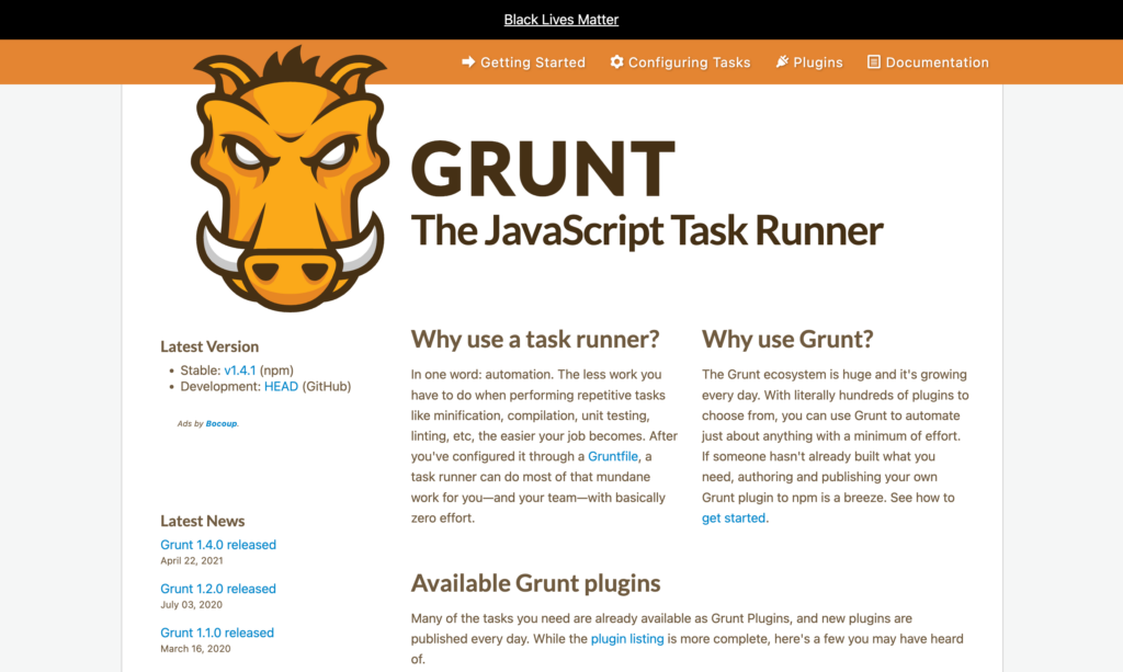 Gruntは最初のリリースが2016年4月で、gulp.jsよりも遅いのですが、最初タスクランナーと言えばGruntだったように記憶しています。Gruntfile.jsという設定ファイルにタスクを記述するのですが、複雑なプロジェクトになると設定ファイルの記述量が増えて管理が煩雑になってしまっていた覚えがあります。
