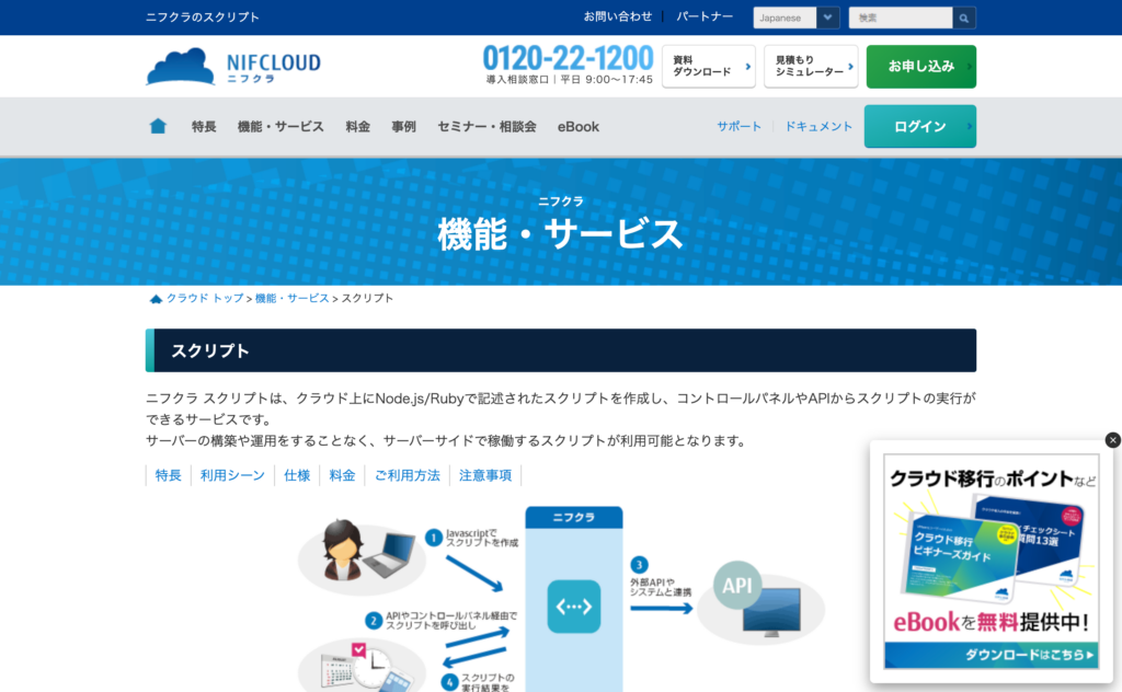日本のパブリッククラウドであるニフクラでもスクリプトという名称でFaaSを提供しています。利用できる言語はNode.jsまたはRubyとなっています。