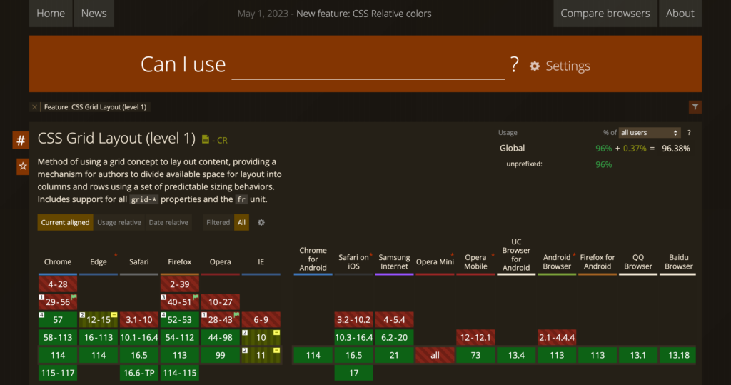 デスクトップやモバイル単位の互換性を調べる場合にはMDN、またはCan I useを使いましょう。Can I useではバージョンも明記され、ブラウザのシェアレベルでどれくらい利用できるかも確認できるので便利です。