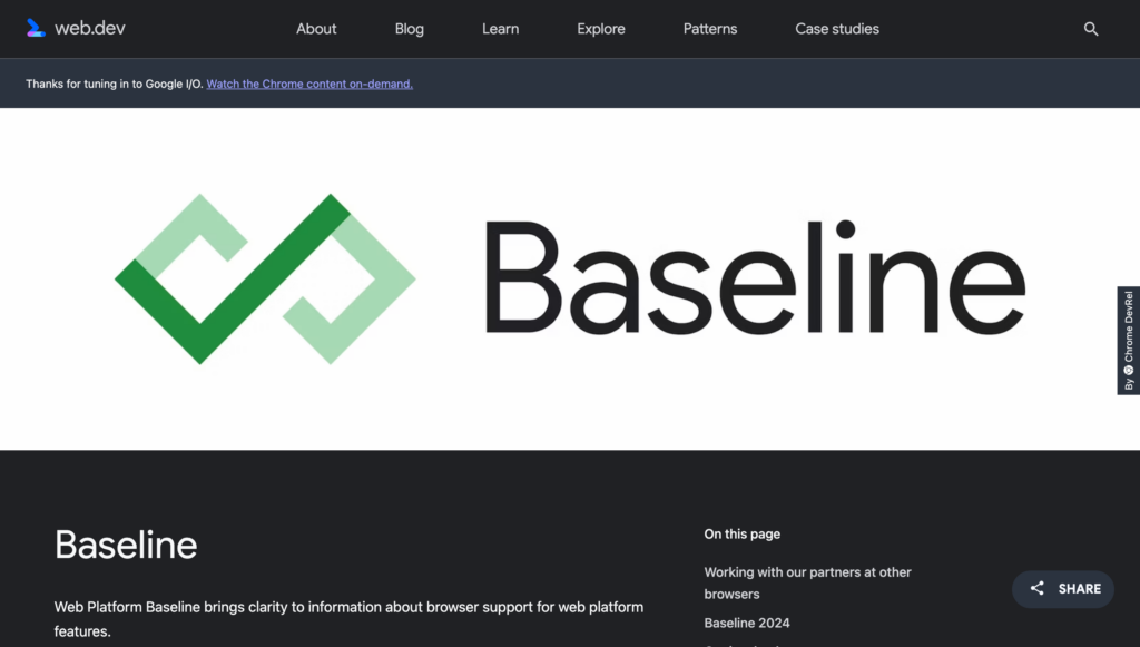 2023年5月に開催されたGoogle I/Oにて発表されたBaseline。これはブラウザ間での互換性がサポートされているAPIを分かりやすく表示するというものです。MDNやweb.devなどのドキュメントで、ブラウザ互換性がある場合にBaselineのマークが付きます。
