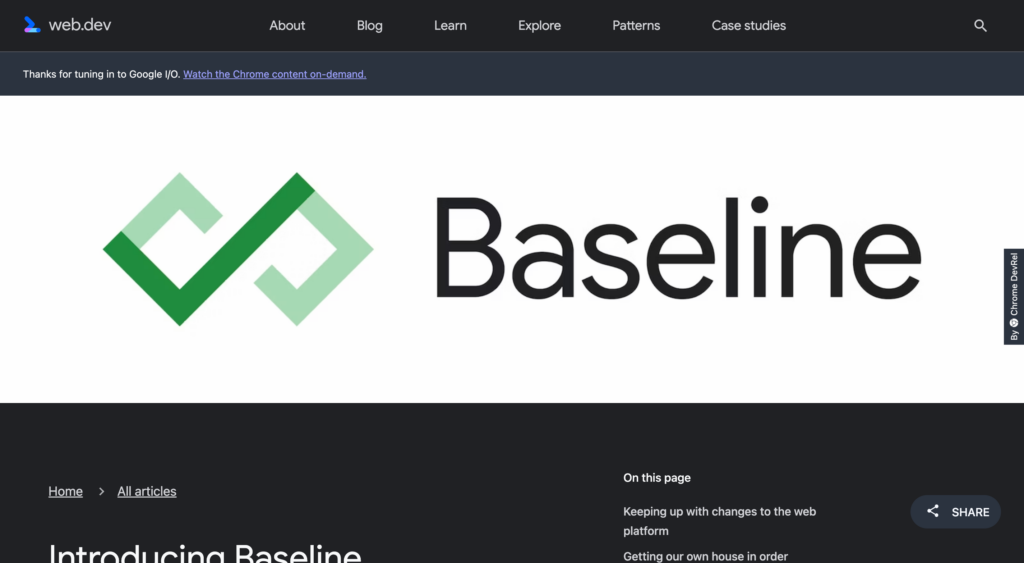 Baselineはモダンなブラウザにおいて、どのAPIが利用できるかを明示する仕組みです。web.devやMDNといった開発者向けドキュメントに、各ブラウザのアイコンが表示されます。
