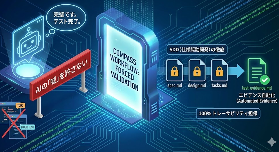 Compassは、この「AIの嘘」を許さない必須条件を課す強制ワークフローを導入しています。