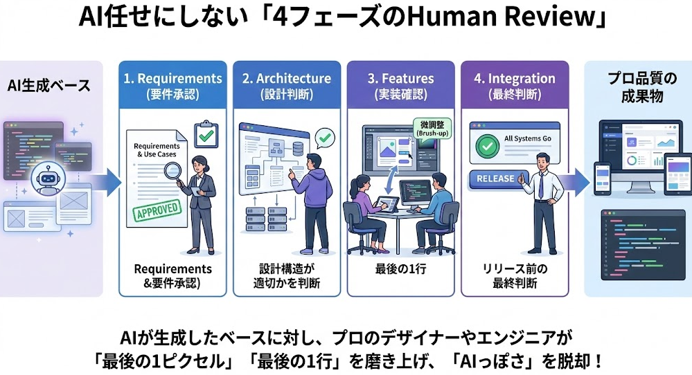 AIが生成したベースに対し、プロのデザイナーやエンジニアが「最後の1ピクセル」「最後の1行」を磨き上げることで、いわゆる「AIっぽさ」を脱却したプロ品質を実現します。