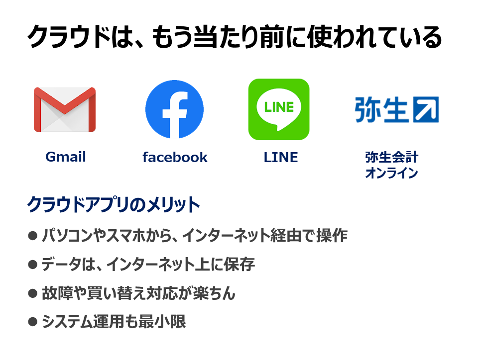 じつは、クラウドは、スマートフォンやWebのアプリで当たり前のように使われています。たとえば、身近なGmailとGoogleカレンダー、LINEやFacebook・TwitterなどのSNS、それに、経理で使っている弥生会計や勘定奉行もクラウドになっています。