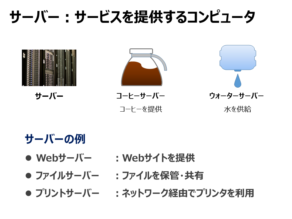 業務用ITシステムに使われるコンピュータを、「サーバー」と呼んでいます。コンピュータのサーバーは、ネットワーク経由でいろいろな処理(サービス)を行ってくれるコンピュータのことです。コーヒーサーバは、コーヒーを提供してくれます。ウォーターサーバーは、おいしい水を提供してくれます。それとよく似た関係です。