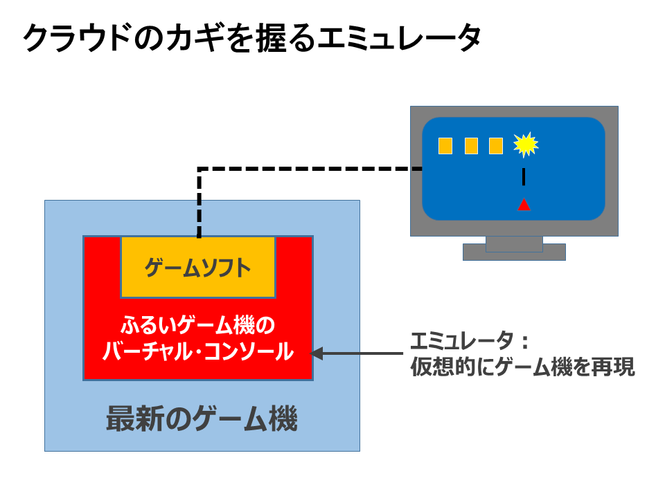 では、クラウドとは一体何でしょうか。そこでヒントになるのが、ゲーム機の「バーチャル・コンソール」です。最近のゲーム機は、昔のゲーム機のソフトがそのまま動きます。これは、最新のゲーム機で古いゲーム機をソフトウェアで再現して、その中で、昔のソフトを動かしているのです。たとえば、任天堂の3DSやSwitchでは、スーパーファミコンやゲームボーイのゲームが、バーチャルコンソールとして遊べます。最新のゲーム機のほうが高性能なので、その中で昔のゲーム機を再現できるんですね。
