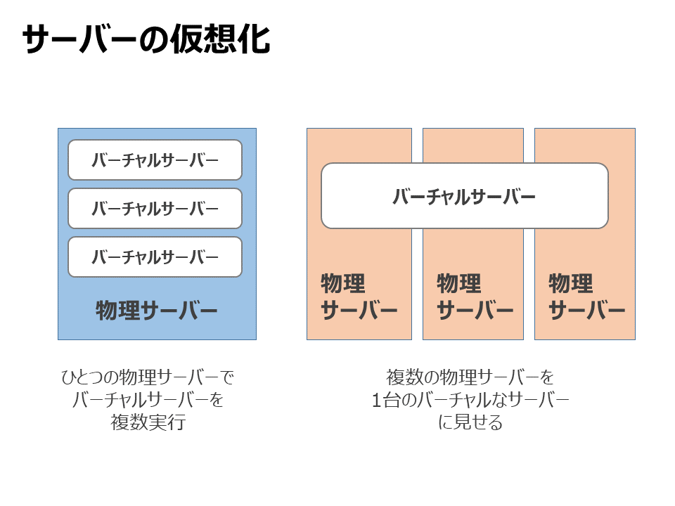 最近のサーバーは高性能なので、仮想化を使って、ひとつの物理サーバーで、バーチャルなサーバーを複数実行できます。複数の物理サーバーを1台のバーチャルなサーバーに見せかけることもできるんです。