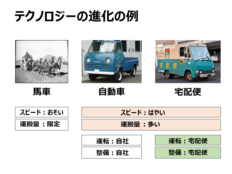 このような進化は、馬車と自動車、宅配便にたとえることができます。