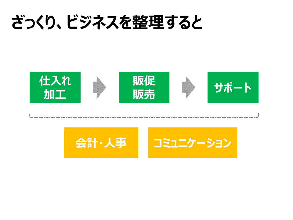 企業には、いろいろなビジネス活動があります。ざっくり整理すると「何かを仕入れて」それを「販売すること」になります。これに付随して、仕入れたものを加工したり、お客様をサポートしたりといった役割りもあります。また、会計や人事といった機能も必要ですね。それから、たくさんの人が集まれば、組織としてのコミュニケーションも重要になります。