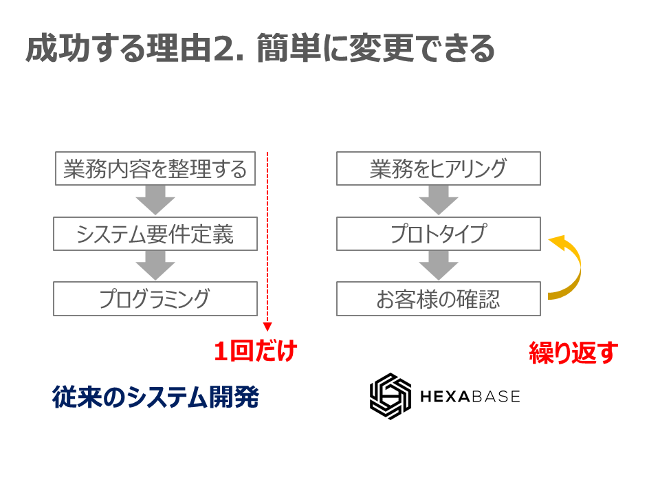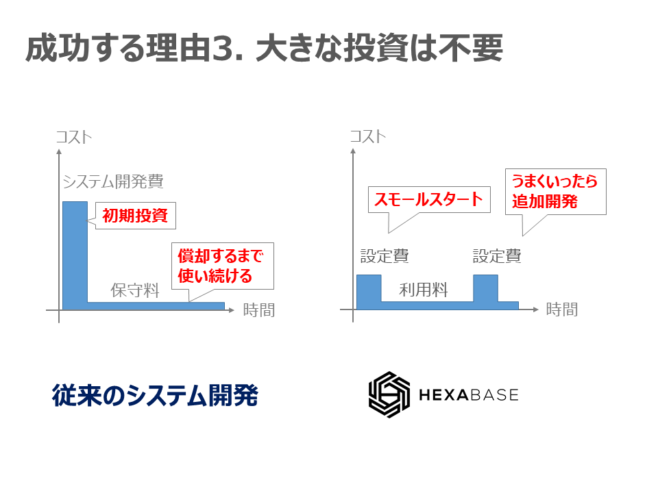 ということは、このような3つの問題を解消できれば、システム開発はもっと成功に近づくはずです。Hexabaseで業務システムを開発すると、この3つの問題を解消して、システムを開発できます。