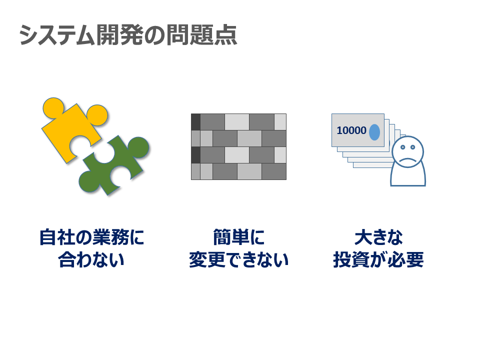 しかし、一度作ってしまうと、システムの操作やデータの持ち方は簡単に変更できません。長年使っていると業務のほうが変化することもあります。システムが変更できなければ、システムに合わせてエクセルでデータを加工するといった余分な仕事が発生する場合もあります。