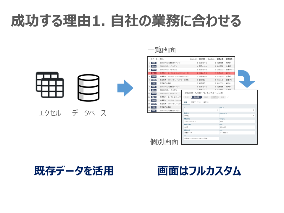 それから、Hexabaseは画面はフルカスタムで開発できます。そのおかげで、自社の業務・自社の作業者に合わせることができるのです。これなら、確実です。