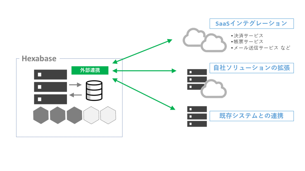 Hexabaseは、外部APIとの連携機能を標準装備しており、容易に外部システムと連携可能です。たとえば、SaaSとのAPi連携で、決済・帳票・メール送信といった外部クラウドサービスを利用できます。また、システム開発会社が持つ独自ソリューションを最小限の改修で拡張したり、お客様の既存システムと連携することが可能です。