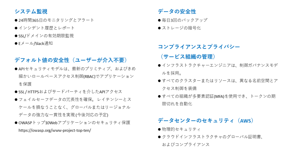 Hexabaseは、高度なセキュリティ対応をクラウド環境上で提供します。システム開発会社によるインフラの運用・保守の手間を大きく減らしながら、高い信頼性を確保できます。