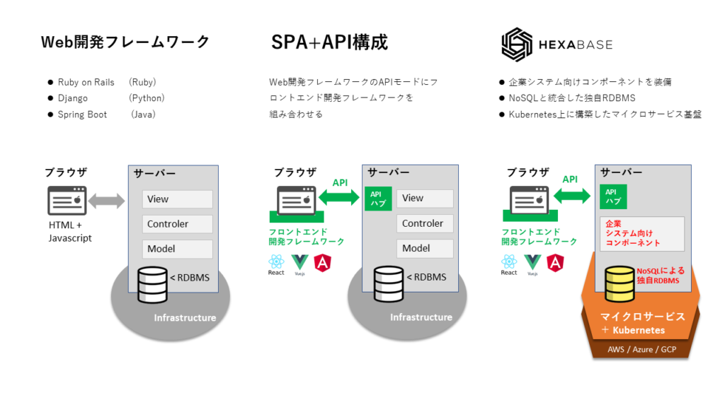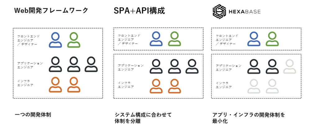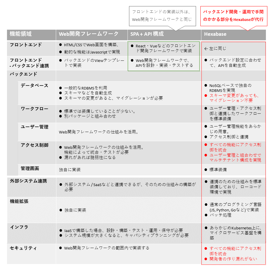 Hexabaseは、このような特徴的な機能を持つことから、通常のWeb開発フレームワークやSPA+API構成と比較して、高い信頼性を持ちながら、バックエンド開発・運用にかかる手間を大きく減らすことができます。