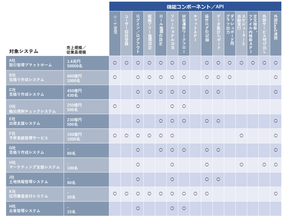 Hexabaseは、企業システムで必要となるRDB・ユーザー管理・アクセス制御・ログ管理といった共通コンポーネントを提供します。これにより、システム開発を効率化し、開発期間の短縮を実現します。