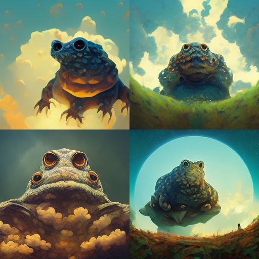 MidjourneyやStable Diffusionなどの画像生成AIでも、生成する画像をコマンドで指示する。たとえばMidjourneyで「Giant toad looking up from below」(下から見上げた巨大なガマガエル)とコマンドを入れると、このような画像が生成されたヨ。
