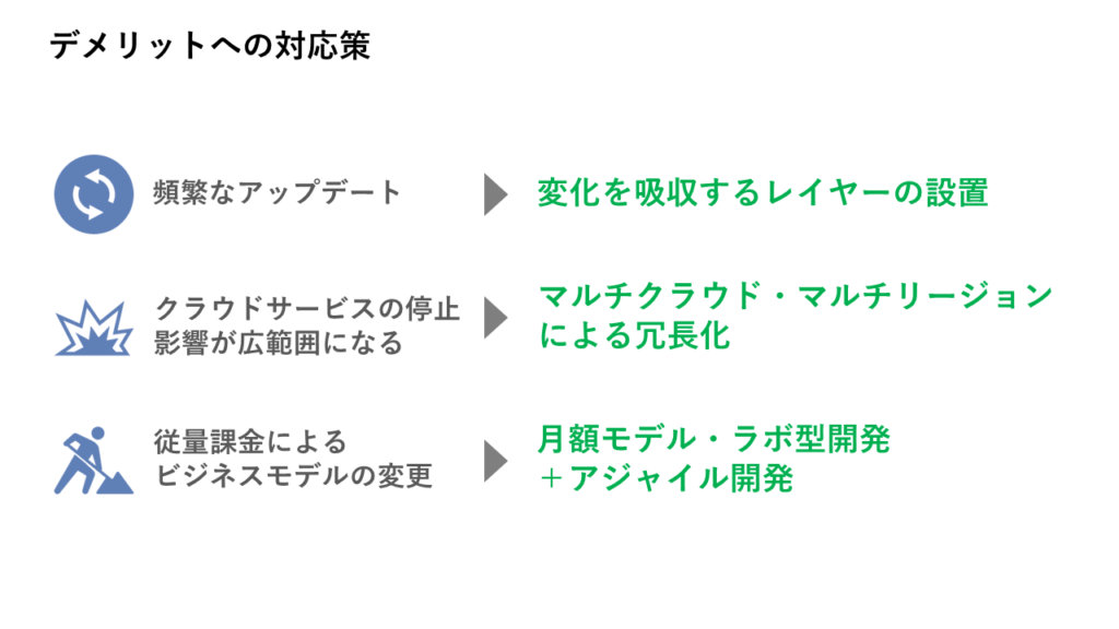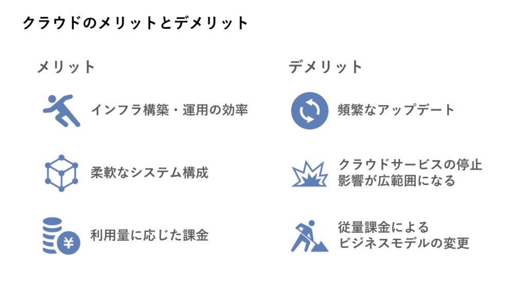 - クラウドサービス自体が停止すると影響が広範囲に及ぶ
