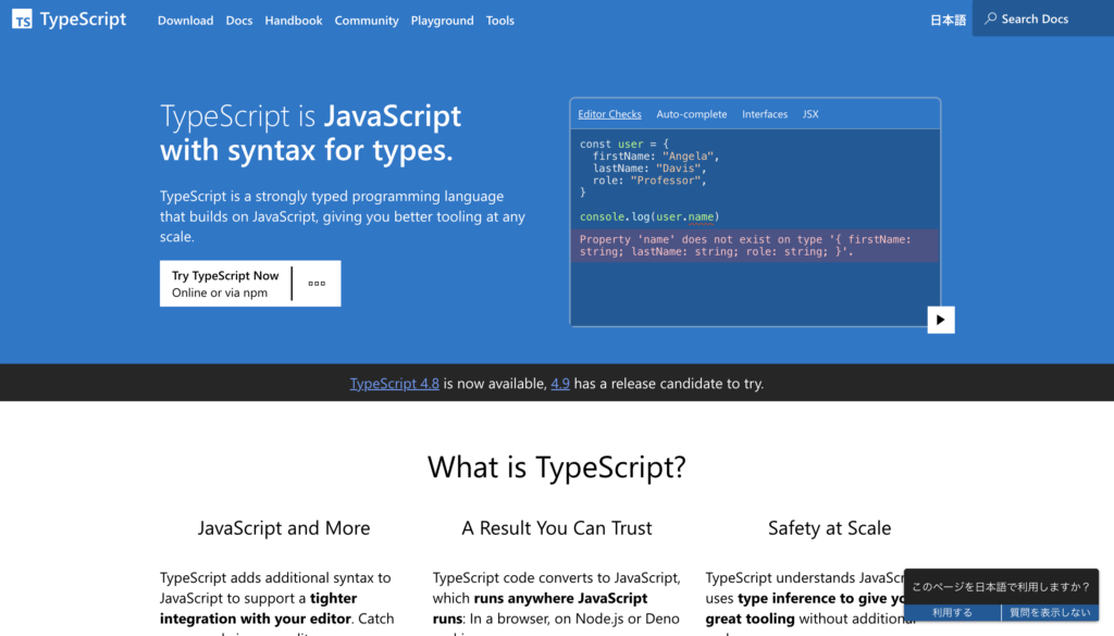 TypeScriptはMicrosoft社により開発されているJavaScriptスーパーセット言語です。JavaScriptはスクリプト言語ということもあり、型付けが行えません。そのため多人数での開発には向かない、長期的なメンテナンスが難しい言語と言われ続けてきました。TypeScriptはJavaScriptに静的型付けやオブジェクト指向を取り入れることで、より品質高い開発を実現します。