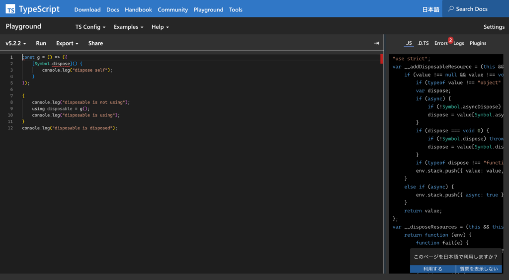 TypeScriptの公式サイトに用意されているプレイグラウンドです。各バージョンごとにTypeScriptを実際に記述して、その結果を確認できます。