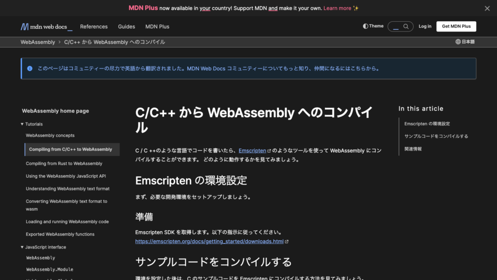 C/C++からWASMバイナリにする場合にはEmscriptenを利用します。変換する際に、それを利用するHTMLファイルも生成してくれます。もちろん全てのAPIが動作する訳ではないので、コードの修正は必須ですが、既存の資産が利用できるメリットは大きいでしょう。