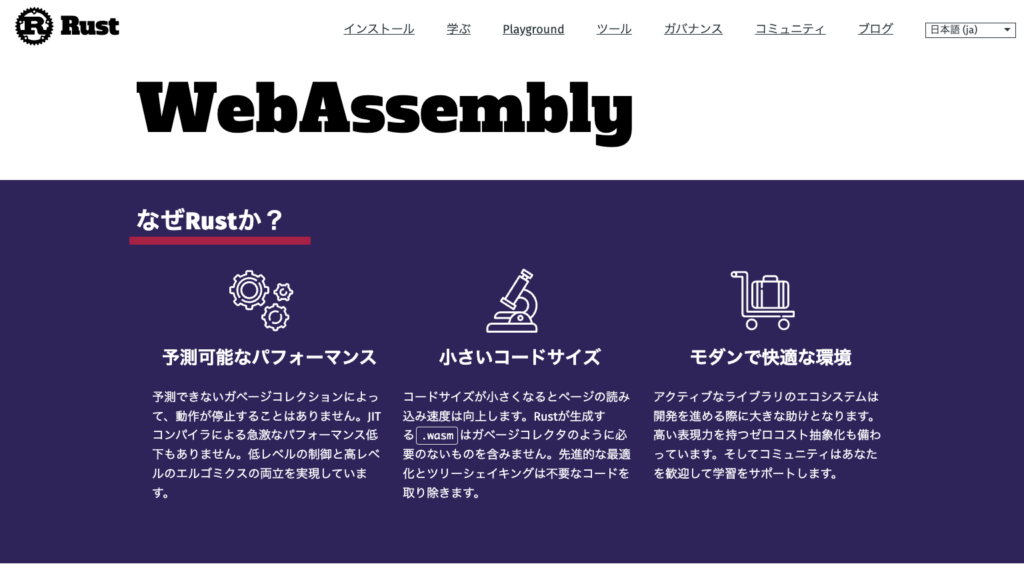 RustはMozillaの開発するプログラミング言語で、WebAssembly向けに開発するのであれば一番お勧めの言語になります。元々RustやC、C++がWebAssembly向けに開発できる言語となっていたので、最新の機能を一番早く実装されるでしょう。