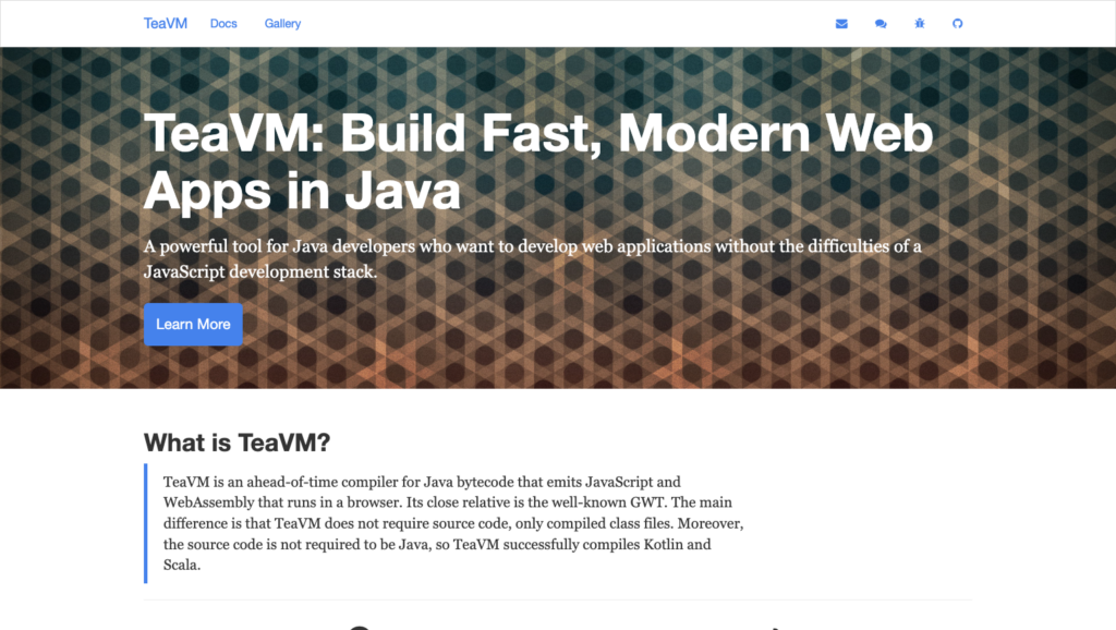 JavaではTeaVMというライブラリがJavaの中間ファイルからWASMバイナリを生成します。面白いのは中間ファイルなので、元々のソースコードを必要としないことです。