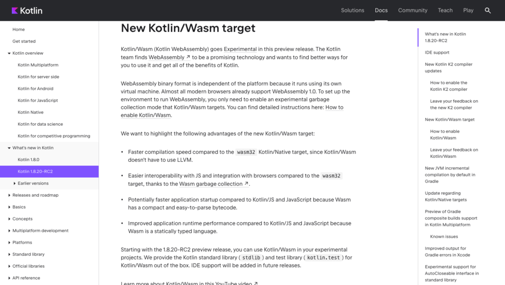 Kotlinについては開発元であるJetbrainにてKotlin/Wasmが開発されています。まだ実験的ということですが、KotlinからWASMバイナリを生成する機能です。