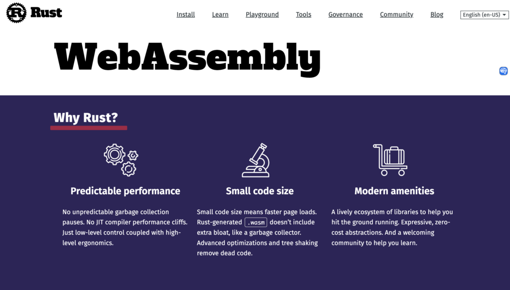 Rust is a programming language developed by Mozilla and is the most recommended language if you are developing for WebAssembly. Since Rust, C, and C++ were originally the languages that could be developed for WebAssembly, it will be the fastest to implement the latest features.