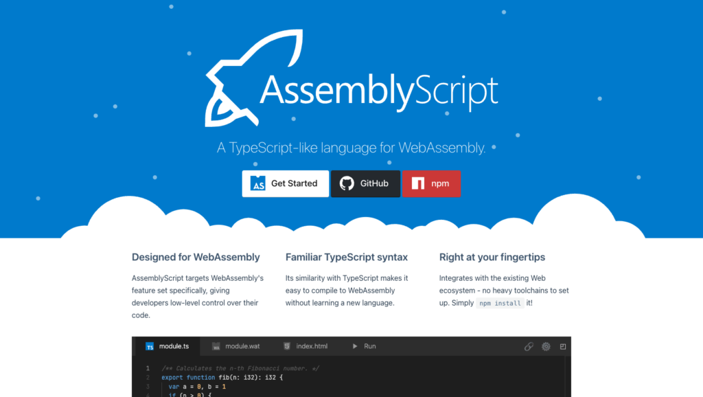 AssemblyScript can then be converted to WebAssembly. The great advantage is that you don’t have to learn a new language, just TypeScript.