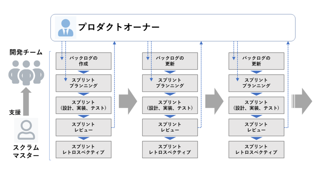 スクラムチームは、スプリントという短い開発サイクルで毎回何らかの評価できる成果物を提供する。プロダクトオーナーは、これを毎回評価して、機能不足や変更があればプロダクトバックログに反映する。