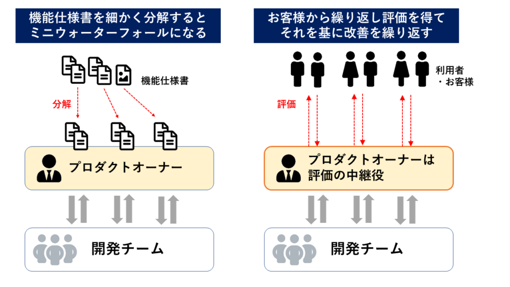 だからプロダクトオーナーは、スプリントの成果物を毎回速やかに公開し、実際にお客様に使ってもらって評価を得る必要がある。プロダクトオーナーはお客様の評価の中継役になるのだ。